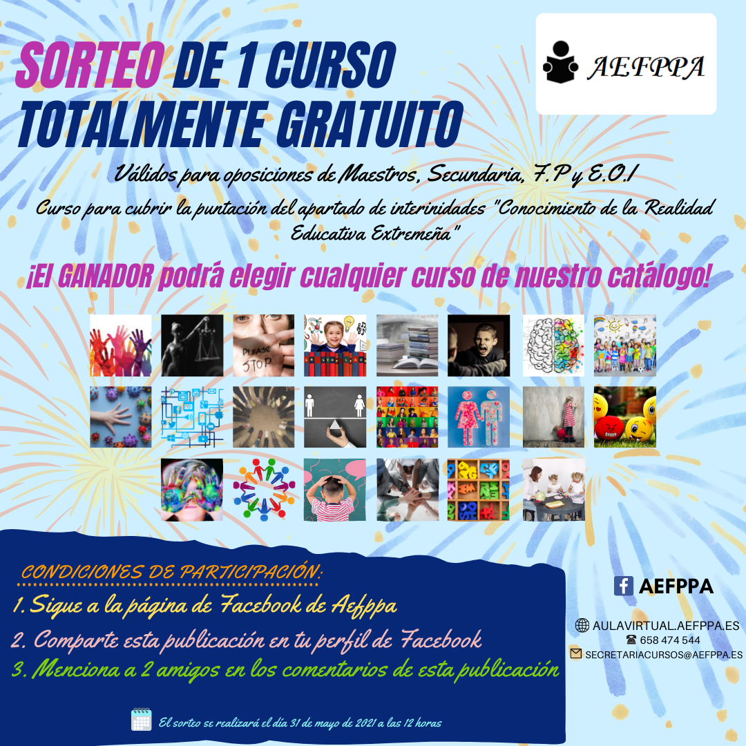 1. Premio: 1 curso online gratuito a elegir del catálogo de los cursos de AEFPPA, válidos para oposiciones de Maestros, Profesores, F.P y E.O.I para cubrir la puntuación del apartado de interinidades “conocimiento de la realidad educativa extremeña”.